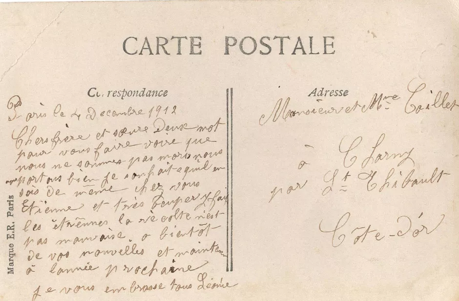 04/12/1912 | Léonie | Monsieur et Madame Caillet | Belle Époque | Bourgogne-Franche-Comté | Saint-Thibault | Carte colorisée |